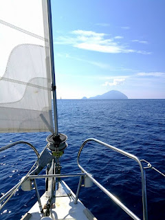 Ore 4,30 deve aver fatto temporale in Calabria, noi al gavitello, esposti a qualunque cosa , cominciamo a rollare, ovviamente i due skipper si svegliano ed hanno finito di dormire.. alle otto molliamo e fuggiamo dal rollio.. lasciata Stromboli finalmente un pò d aria, si va a vela verso Panarea, durante il tragitto a vela di bolina ,incrociamo una barca a vela a motore che a 7 nodi si avvicina e ci rimprovera di non avergli dato acqua… dimenticando che noi siamo a vela, ed in realtà lontanissimi prima del suo avvicinamento.. ok sempre più gente per mare con la testa da automobilista.. poco male, andiamo all’ancora a cala Milazzese a Panarea, per un bagno fantastico nelle acque trasparenti ed un pranzetto in rada.