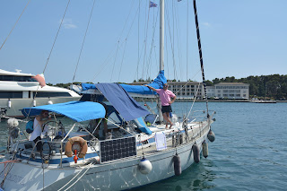 con 15 nodi gagliardi di vento dirigiamo su lussino per tornare un attimo alla civiltà ed andare al supermercato , superando un so 37 a motore che esterefatto ci osserva superarlo nel nostro assoluto silenzio , serata al noto ristorante n1.. con le ragazze tirate di tutto punto..
